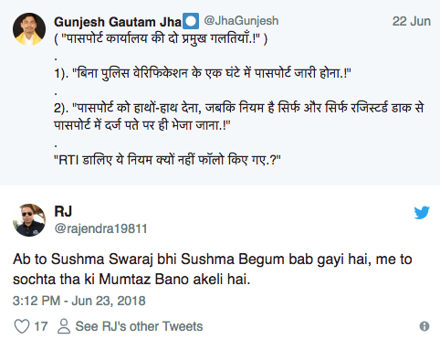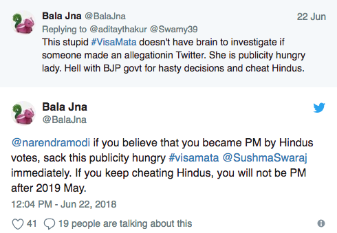 वहीं रविवार को पांच देशों की यात्रा से लौटने के बाद सुषमा ने तंज भरे शब्दों में ट्वीट किया कि वह 17 से 23 जून तक देश से बाहर थीं। उन्हें नहीं पता कि उनकी गैरमौजूदगी में क्या हुआ? लेकिन कुछ ट्वीट से सम्मानित किया गया है। इन्हें वह साझा कर रही हैं। इन्हें उन्होंने लाइक किया है। उन्होंने ट्विटर पर 100 से अधिक ट्वीट लाइक किए। इन ट्वीट में उन पर और मंत्रालय पर धर्म विशेष के लोगों का तुष्टिकरण करने का आरोप लगाया गया है।
