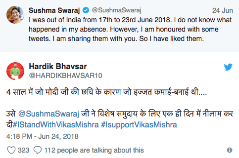 सुषमा ने रविवार रात ट्विटर पर लिखा कि ‘मैं 17 से 23 जून 2018 के बीच भारत से बाहर थी। मैं नहीं जानती कि मेरी अनुपस्थिति में क्या हुआ। हालांकि, मुझे कुछ ट्वीट से सम्मानित किया गया। मैं इसे आपके साथ साझा कर रही हूं। इसलिये मैंने उन्हें पसंद किया है।