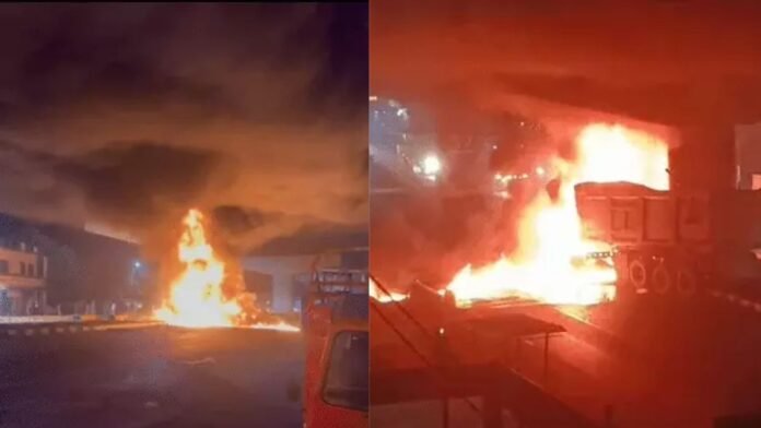UP: लखनऊ (Lucknow) के बंथरा थाना क्षेत्र में रात 11:30 बजे एक दिल दहला देने वाली दुर्घटना हुई है। दादूपुर मोड़ के पास बंथरा बाजार के नजदीक एक डंपर (Dumper) का अगला दाहिना टायर अचानक तेज धमाके के साथ फट गया। अनियंत्रित होकर डंपर सीधे फ्लाईओवर के एलिवेटेड रोड के पिलर से जा टकराया। टक्कर इतनी जोरदार थी कि डंपर में तुरंत आग लग गई और करीब 45 मिनट तक वह लगातार जलता रहा। आग की लपटें ऊपर एलिवेटेड रोड तक पहुंच रही थीं और आसपास का पूरा आसमान काला धुआं से भर गया।