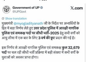 UP: उत्तर प्रदेश सरकार ने पुलिस भर्ती को लेकर बड़ी घोषणा की है। राज्य में कुल 32,679 पदों पर भर्ती के लिए आयु सीमा में 3 साल की छूट देने का निर्णय लिया गया है। इस फैसले से उन उम्मीदवारों को बड़ी राहत मिली है जो आयु सीमा की वजह से आवेदन करने में असमर्थ थे।सरकार ने स्पष्ट किया है कि यह 3 साल की छूट सभी वर्गों के अभ्यर्थियों के लिए लागू होगी, चाहे वे जनरल, ओबीसी या एससी/एसटी श्रेणी के हों। यह छूट सीधी भर्ती में शामिल सभी पदों पर लागू होगी।
