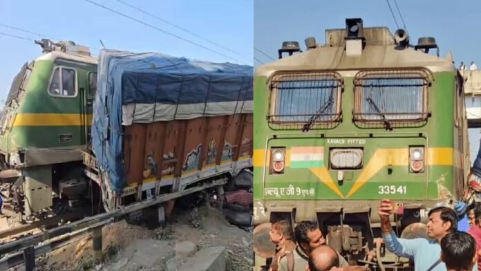 झारखंड के देवघर जिले में आज (22 जनवरी 2026) सुबह एक बड़ा रेल हादसा होते-होते टल गया। जसीडीह-मधुपुर रेलखंड पर रोहिणी-नावाडीह रेलवे फाटक (गुमटी नंबर 27) के पास गोंडा से आसनसोल जा रही ट्रेन नंबर 13510 गोंडा-आसनसोल एक्सप्रेस ने पटरी पर फंसे चावल (धान) से लदे ट्रक को पीछे से जोरदार टक्कर मार दी। फाटक जाम होने या बंद न होने के कारण ट्रक पटरी पर अटक गया था। टक्कर से ट्रक बुरी तरह क्षतिग्रस्त हो गया और उसके साथ खड़ी दो बाइक भी चपेट में आ गईं, जिसमें 2 बाइक सवार घायल हुए हैं। गनीमत रही कि ट्रेन नहीं पलटी और कोई यात्री घायल नहीं हुआ। हादसे का वीडियो सोशल मीडिया पर वायरल हो रहा है, जिसमें ट्रेन की टक्कर और अफरा-तफरी का मंजर साफ दिख रहा है। रेलवे ने जांच शुरू कर दी है।
