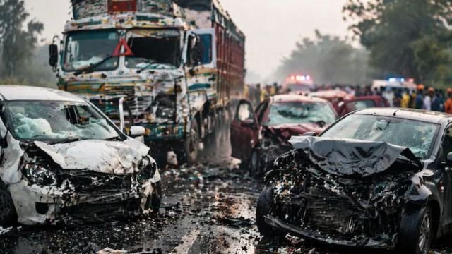 उत्तर प्रदेश : हापुड़ जिले में रविवार देर रात करीब 1:30 बजे शादी की बारात से लौट रही बस की एक तेज रफ्तार ट्रक से भीषण टक्कर हो गई। हादसे में 6 लोगों की मौके पर ही मौत हो गई जबकि 7 अन्य गंभीर रूप से घायल हो गए। बारात गाजियाबाद के डासना से बुलंदशहर के गुलावठी गई थी और वापसी के दौरान यह दर्दनाक हादसा हुआ। पुलिस ने बताया कि अंधेरे और तेज रफ्तार मुख्य कारण रहे।