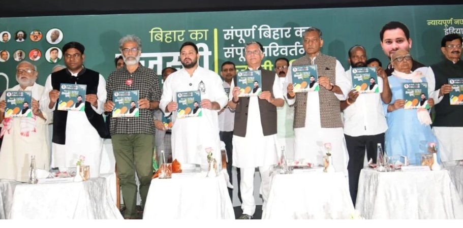 बिहार विधानसभा चुनाव से ठीक पहले महागठबंधन ने शुक्रवार को अपना साझा घोषणा पत्र जारी किया, जिसका नाम रखा गया है ‘बिहार का तेजस्वी प्रण’। इस घोषणा पत्र में युवाओं को रोजगार, महिलाओं को सम्मान और आम जनता को राहत देने वाले कई बड़े वादे शामिल हैं। गठबंधन का दावा है कि यह केवल चुनावी वादों का दस्तावेज नहीं, बल्कि बिहार के पुनर्निर्माण की ठोस रूपरेखा है।