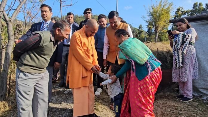पंचूर (पौड़ी गढ़वाल): 7 फरवरी। उत्तराखंड दौरे पर पहुंचे उत्तर प्रदेश के मुख्यमंत्री योगी आदित्यनाथ ने शुक्रवार को अपने पैतृक गांव पंचूर में रात्रि विश्राम किया। शनिवार सुबह उन्होंने अपने गांव के बड़े-बुजुर्गों का हालचाल जाना और बच्चों को दुलार किया। इस दौरान मुख्यमंत्री योगी आदित्यनाथ का बालप्रेम उमड़ आया। उन्होंने गांव के बच्चों पर अपना स्नेह बरसाया, उनसे बातचीत की और उन्हें चॉकलेट भी दी। सीएम योगी ने एक बच्चे को अपनी गोद में लेकर उसे प्रेम से खिलाया। बच्चों ने भी सहज भाव से मुख्यमंत्री से बातचीत की। इस दौरान, गांव के लोगों ने मुख्यमंत्री योगी आदित्यनाथ के साथ सेल्फी भी ली।