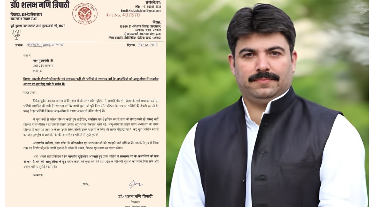 देवरिया: उत्तर प्रदेश पुलिस भर्ती एवं प्रोन्नति बोर्ड (UPPRPB) द्वारा हाल ही में जारी 32,679 पदों (आरक्षी सिविल पुलिस, पीएसी, जेल वार्डर एवं समकक्ष) की भर्ती में सामान्य वर्ग के अभ्यर्थियों के लिए आयु सीमा में 3 वर्ष की छूट देने की मांग जोर पकड़ रही है। इस मुद्दे पर देवरिया सदर से भाजपा विधायक डॉ. शलभ मणि त्रिपाठी ने मुख्यमंत्री योगी आदित्यनाथ (CM Yogi Adityanath) को पत्र लिखकर मानवीय आधार पर छूट देने की अपील की है। विधायक शलभ मणि त्रिपाठी (Shalabh Mani Tripathi) ने अपने पत्र में कहा कि भर्ती में कई वर्षों की देरी के कारण हजारों सामान्य वर्ग के युवा ओवरएज हो चुके हैं। ये अभ्यर्थी वर्षों से तैयारी कर रहे थे, लेकिन अब आयु सीमा के कारण आवेदन नहीं कर पा रहे। कई अभ्यर्थी आर्थिक रूप से कमजोर परिवारों से हैं और उनकी उम्मीदें इसी भर्ती से जुड़ी हुई हैं। उन्होंने कम से कम 3 साल की आयु छूट देने का अनुरोध किया, ताकि लाखों युवाओं को न्याय मिल सके और उनका भविष्य सुरक्षित हो।