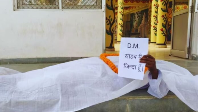 बस्ती: उत्तर प्रदेश (Uttar Pradesh) के बस्ती (Basti) जिले में एक अनोखा और चौंकाने वाला मामला सामने आया है। यहां एक बुजुर्ग व्यक्ति कफन ओढ़कर जिलाधिकारी कार्यालय पहुंच गया और दफ्तर के अंदर लेटकर खुद को जिंदा साबित करने की गुहार लगाने लगा। इस घटना से प्रशासनिक परिसर में हड़कंप मच गया और सूचना मिलते ही अधिकारी मौके पर पहुंच गए।