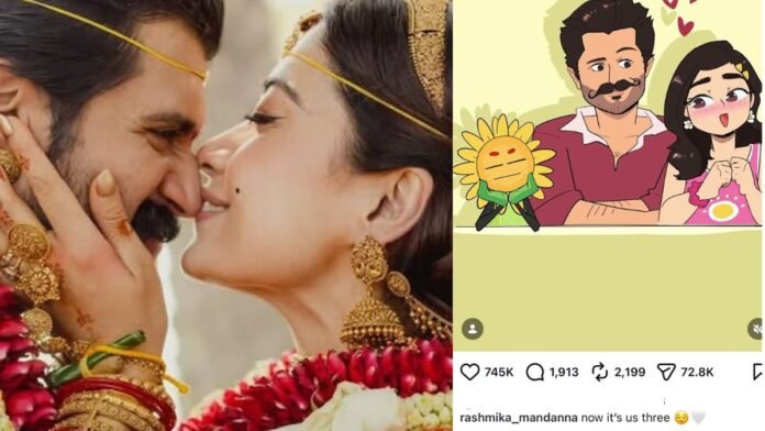 शादी के एक महीने बाद रश्मिका मंदाना एक बार फिर सुर्खियों में हैं। हाल ही में एक्ट्रेस ने इंस्टाग्राम पर एक पोस्ट शेयर किया, जिसे देखकर फैंस में हलचल मच गई। पोस्ट में रश्मिका और विजय के इर्द-गिर्द पीले फूलों वाला ग्राफिक्स दिखाई दे रहा है। कैप्शन में रश्मिका ने लिखा, अब हम तीन हो गए हैं, जिससे फैंस के मन में सवाल उठने लगे कि क्या रश्मिका प्रेग्नेंट हैं।