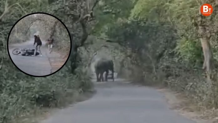 UP: बहराइच (Bahraich) जिले में सोमवार शाम करीब 4:30 बजे गिरिजापुरी पेट्रोल पंप से सुजौली जाने वाले मुख्य मार्ग पर जमुनिहा मोड़ बदलू चौराहे के पास उस समय अफरा-तफरी मच गई, जब जंगल से निकलकर एक टस्कर हाथी अचानक सड़क पर आ गया। इसी दौरान बिछिया निवासी सुजीत निषाद अपने चाचा राजकुमार लाला के साथ बाइक से सुजौली की ओर जा रहे थे। अचानक सामने हाथी को देख दोनों ने सूझबूझ दिखाते हुए बाइक छोड़ दी और भागकर अपनी जान बचाई।