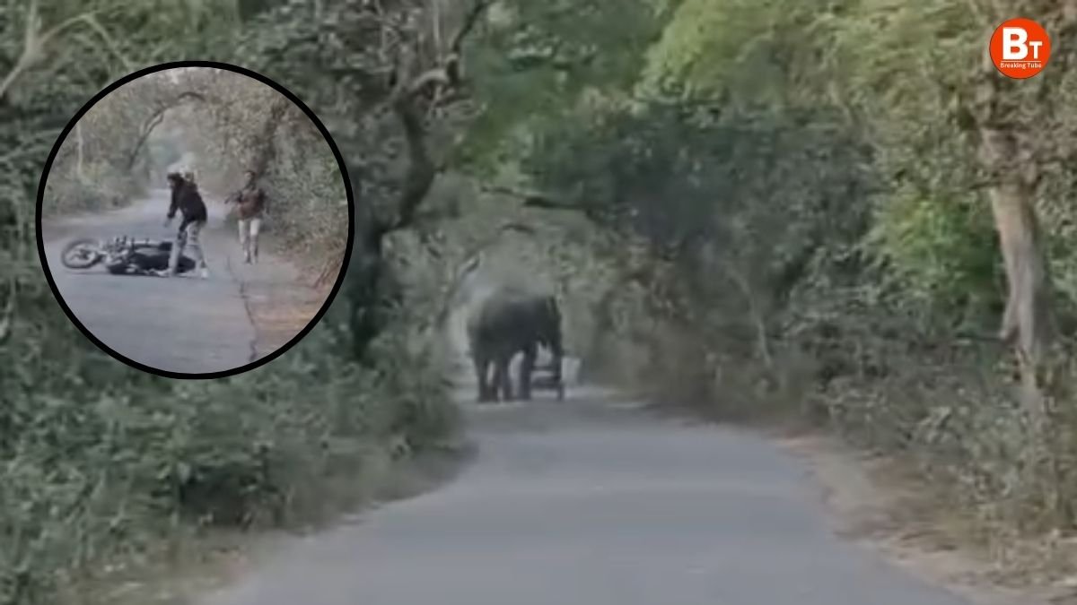 UP: बहराइच (Bahraich) जिले में सोमवार शाम करीब 4:30 बजे गिरिजापुरी पेट्रोल पंप से सुजौली जाने वाले मुख्य मार्ग पर जमुनिहा मोड़ बदलू चौराहे के पास उस समय अफरा-तफरी मच गई, जब जंगल से निकलकर एक टस्कर हाथी अचानक सड़क पर आ गया। इसी दौरान बिछिया निवासी सुजीत निषाद अपने चाचा राजकुमार लाला के साथ बाइक से सुजौली की ओर जा रहे थे। अचानक सामने हाथी को देख दोनों ने सूझबूझ दिखाते हुए बाइक छोड़ दी और भागकर अपनी जान बचाई।
